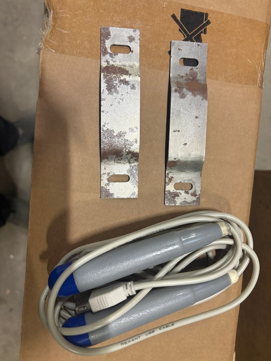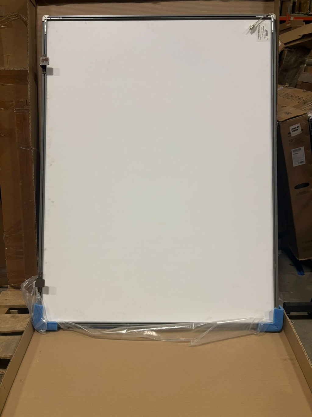 Упаковка вскрывалась. Оборудование использовалось. Есть небольшая трещина с угла. Рабочая поверхность не пострадала. В комплекте 2 стилуса, кабель USB, крепление на стену(есть ржавчина)