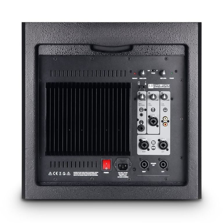 В системе используются все стандартные системы защиты. Встроенный лимитер защищает DAVE 8 ROADIE от перегрузок и обеспечивает длительный срок службы. На боковой стороне сабвуфера, в дополнение к переключателю ON / OFF и переключателю реверса фазы (180°), имеется отдельная ручка регулировки громкости сабвуфера, которая позволяет найти идеальное сочетание ярких высоких частот, мощных средних и нижних частот.