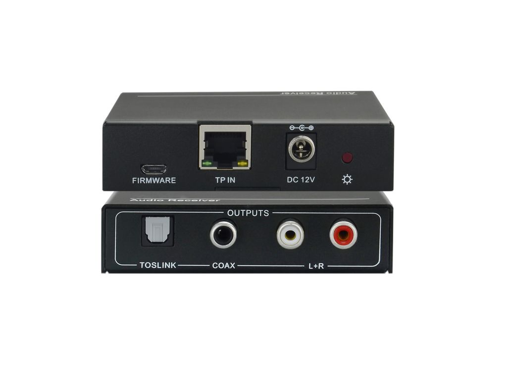 Стерео / коаксиальный / оптический (TOSLINK) входы и выходы, передпача стерео до 170м и цифрового аудио до 290м по FTP Cat 5e/6/6a, POC от приемника