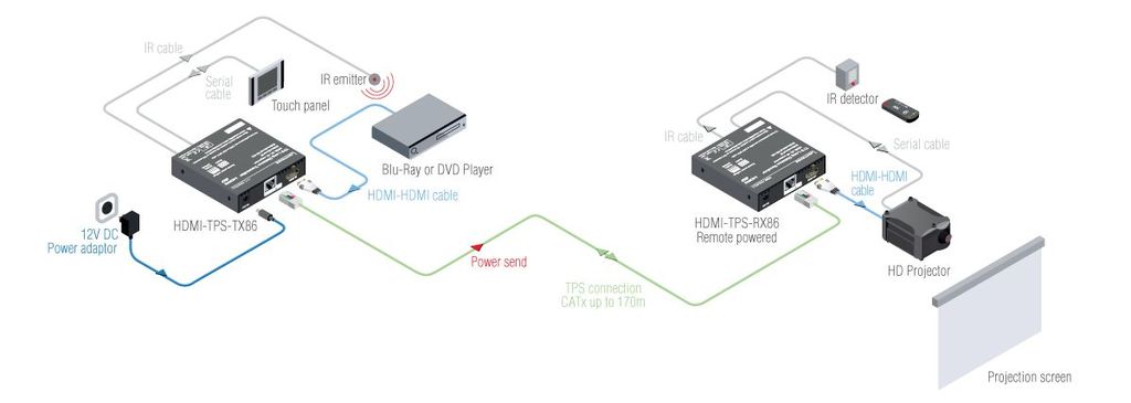 Удлинители HDMI-TPS-TX86 и HDMI-TPS-RX86 на витой паре HDBaseTTM обеспечивают передачу несжатого Full-HD видео на большие расстояния по одному кабелю CATx. Устройство обеспечивает двунаправленный проход RS-232 и ИК-порт по тому же кабелю CATx, по которому передается видеосигнал. Удлинители TPS поддерживают полное соответствие HDCP и EDID и работают со всеми стандартными AV-разрешениями вплоть до 4K и 48-битной глубиной цвета, поддерживая все стандартные аудиоформаты, а также 120 Гц 3D-сигналы. Удаленное питание доступно через один кабель CATx, но можно использовать и локальный источник питания. Все устройства могут быть установлены на полке в стойке или использоваться автономно.