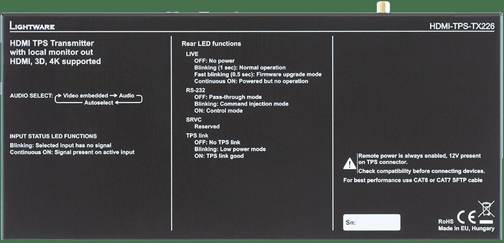 - Перекрестная совместимость с удлинителями и платами ввода/вывода серии TPS Lightware (совместимость с HDBaseT)